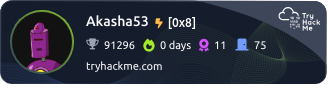 Akasha Hey 👋, I'm Akasha I'm an IT student and I have a strong interest for the Cybersecurity realm. Connect with me: Discord : paktol Languages and Tools: Try Hack Me satus : Link to it Root Me Status: Link to it