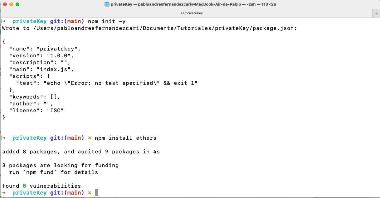¡Importante! Antes de continuar, asegúrate de tener Node.js instalado en tu sistema.Una vez instalado Node.js, crea una nueva carpeta para tu proyecto y ejecuta npm init -y en una terminal para inicializar un nuevo proyecto de Node.js. Luego, instala la librería ethers.js usando el comando npm install ethers, que es esencial para trabajar con Ethereum.