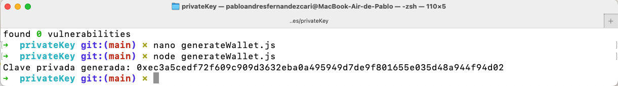 console.log('Clave privada generada:', privateKey);Podedemos hacer un nano generateWallet.js y pegar el codigo anterior. (No olvides guardar el archivo con Ctrl + O y salir con Ctrl + X)