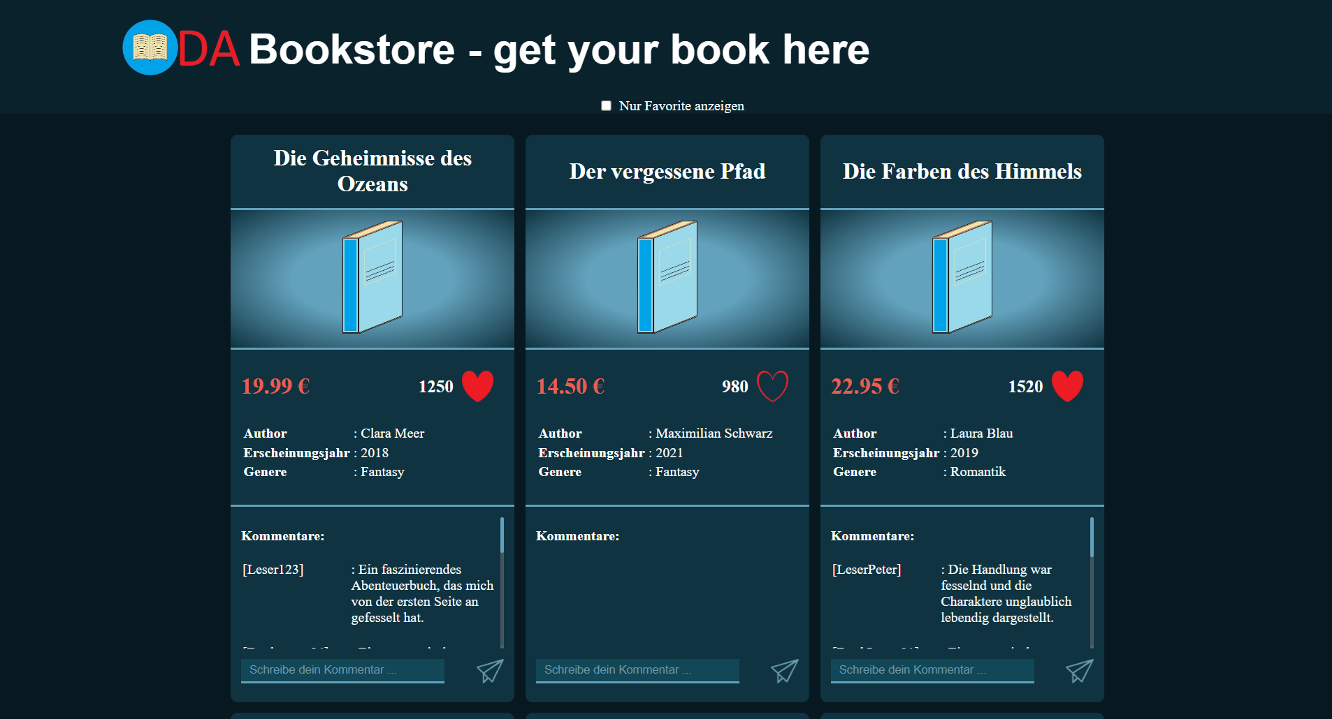 Bookstore is a dynamic web application designed to browse and interact with a digital library. This was my first project where I implemented Data Persistence, allowing the application to remember user interactions even after a page reload.