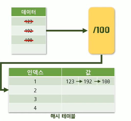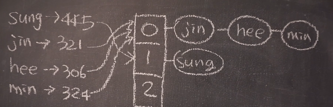 - 배열방에 할당한다. index가 중복 되는 value는 linked list로 연결시킨다.