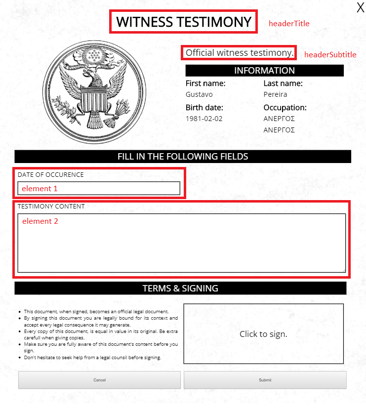 Each document is assigned to a specific category. This category can be public for everyone or a job name to be accessible only by citizens in that specific job. Each document consists of a headerTitle, headerSubtitle and elements. headerTitle and headerSubtitle are self explanatory. Elements are the fields which a user fills in, in a document. An element, so far, can either be input or textarea. Each element has the following properties: