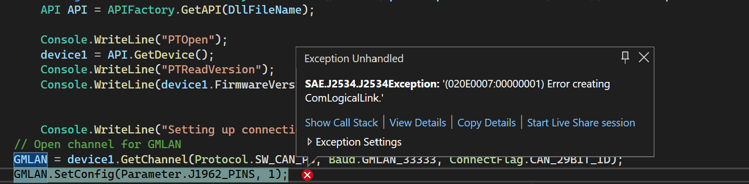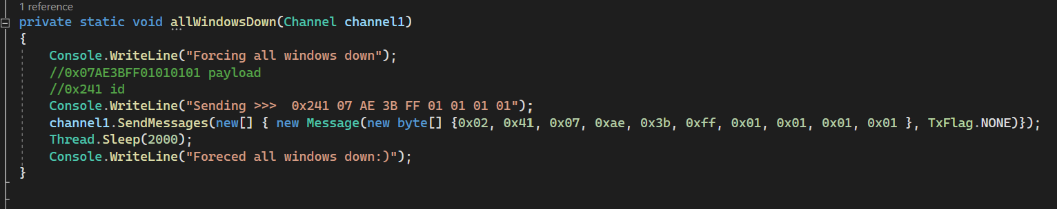 I stumbled across this library while looking for an interface to write a simple program to send messages on the GMLAN. My car is a 2014 Cadillac ELR. I have a packet that I want to try to send. I was told that the following message is correct to send (it commands the windows to roll down) but as I connect to the network and try to send, nothing happens and an exception is thrown. Am I not correctly setting up my connection to the GMLAN or formatting the CAN message correctly?