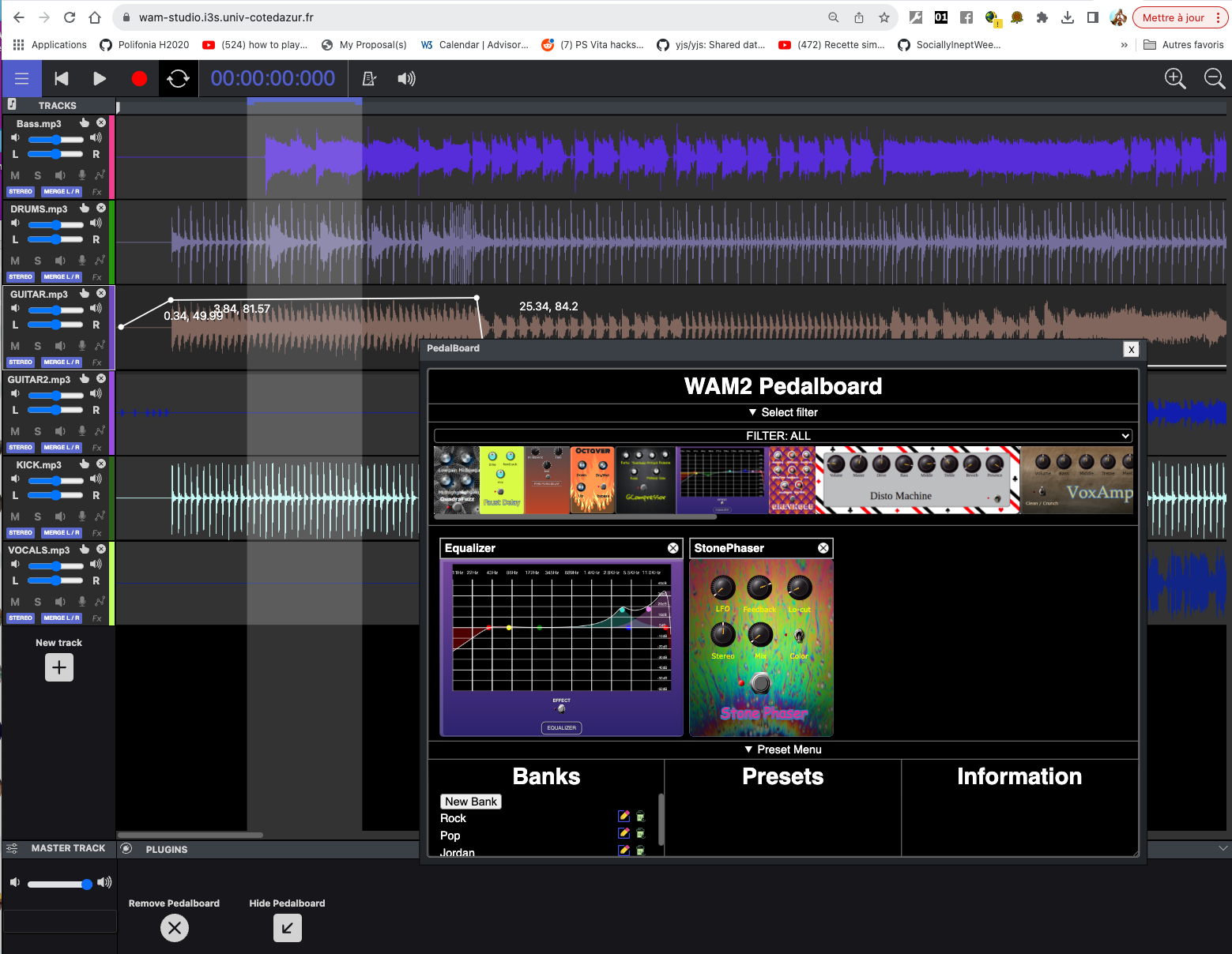 Wam-Studio’s is an online tool for creating audio projects that you can imagine as multi-track music. Each track corresponds to a different "layer" of audio content that can be recorded, edited, or just integrated (using audio files for example). Some track can be used to control virtual instruments: in that case we record the sound that is generated internally by these virtual instruments (and played using a MIDI piano keyboard, for example). Tracks can be added or removed, played isolated or with other tracks. They can also be "armed" for recording, and when the recording starts, all other tracks will play along, while the armed track will record new content.