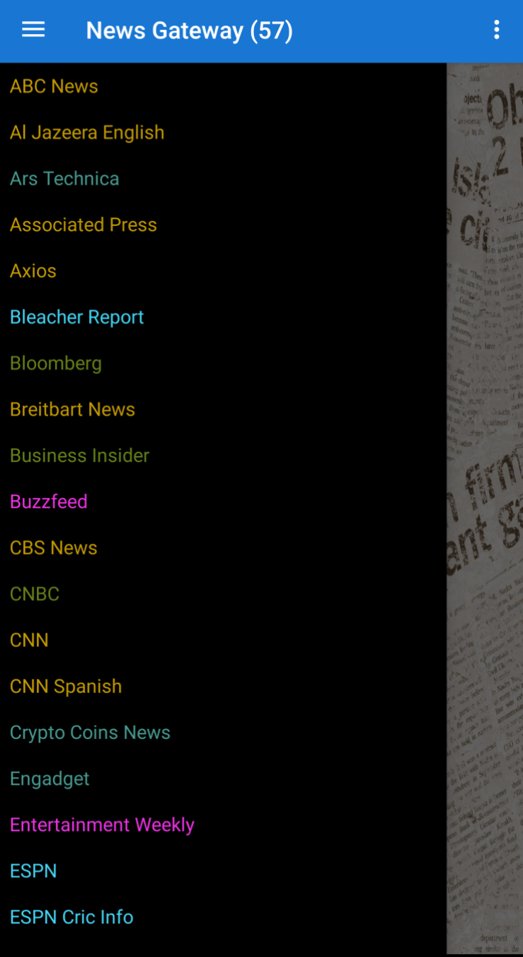 The top left hamburger menu opens a drawer of news sources that match the set filters.