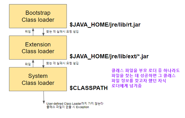 System Loader가 클래스를 로딩할 때 그 로딩 요청은 부모 로더들로 거슬러 올라가서 부트스트랩 로더에 다다른 뒤 그 밑으로 요청을 수행하는 방식을 취한다.