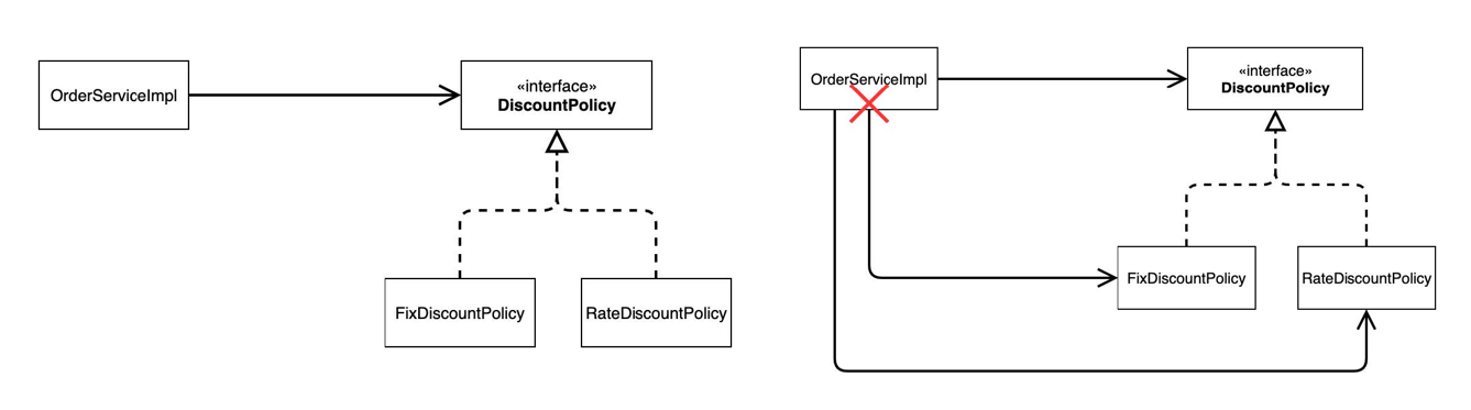 OrderServiceImpl은DiscountPolicy뿐만 아니라 그 구현체인FixDiscountPolicy혹은RateDiscountPolicy를 의존하고 있다. -