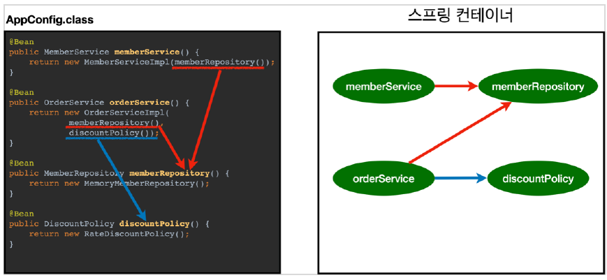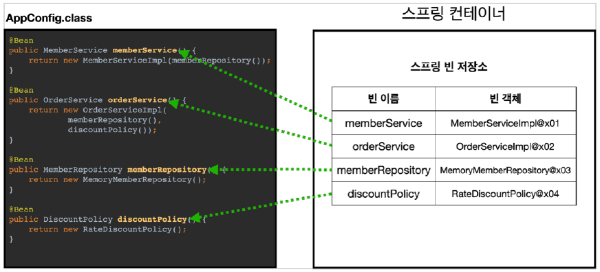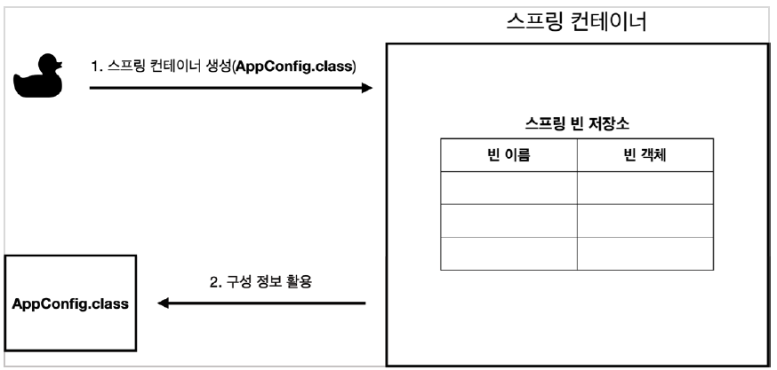 - 스프링 컨테이너는 파라미터로 넘어온 설정 클래스 정보를 사용해서 스프링 빈을 등록한다.