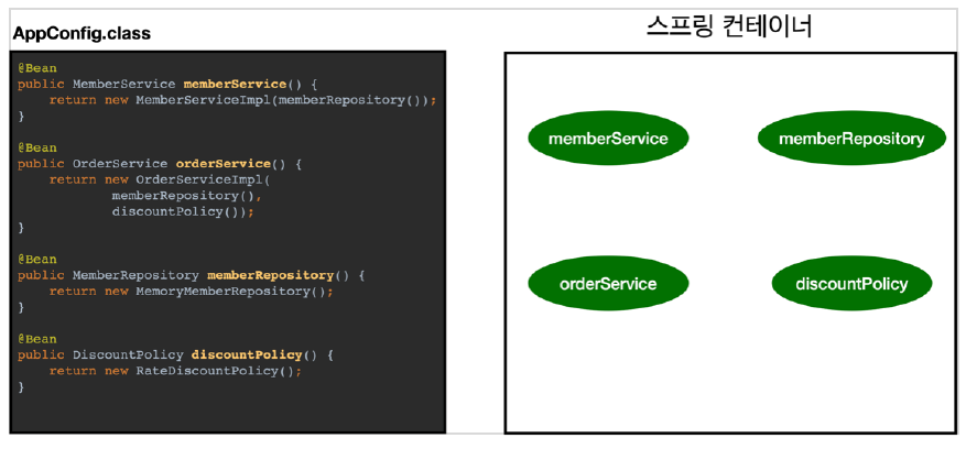 - 각 메서드에 @Bean을 붙이면 스프링 컨테이너에 자동으로 등록된다.