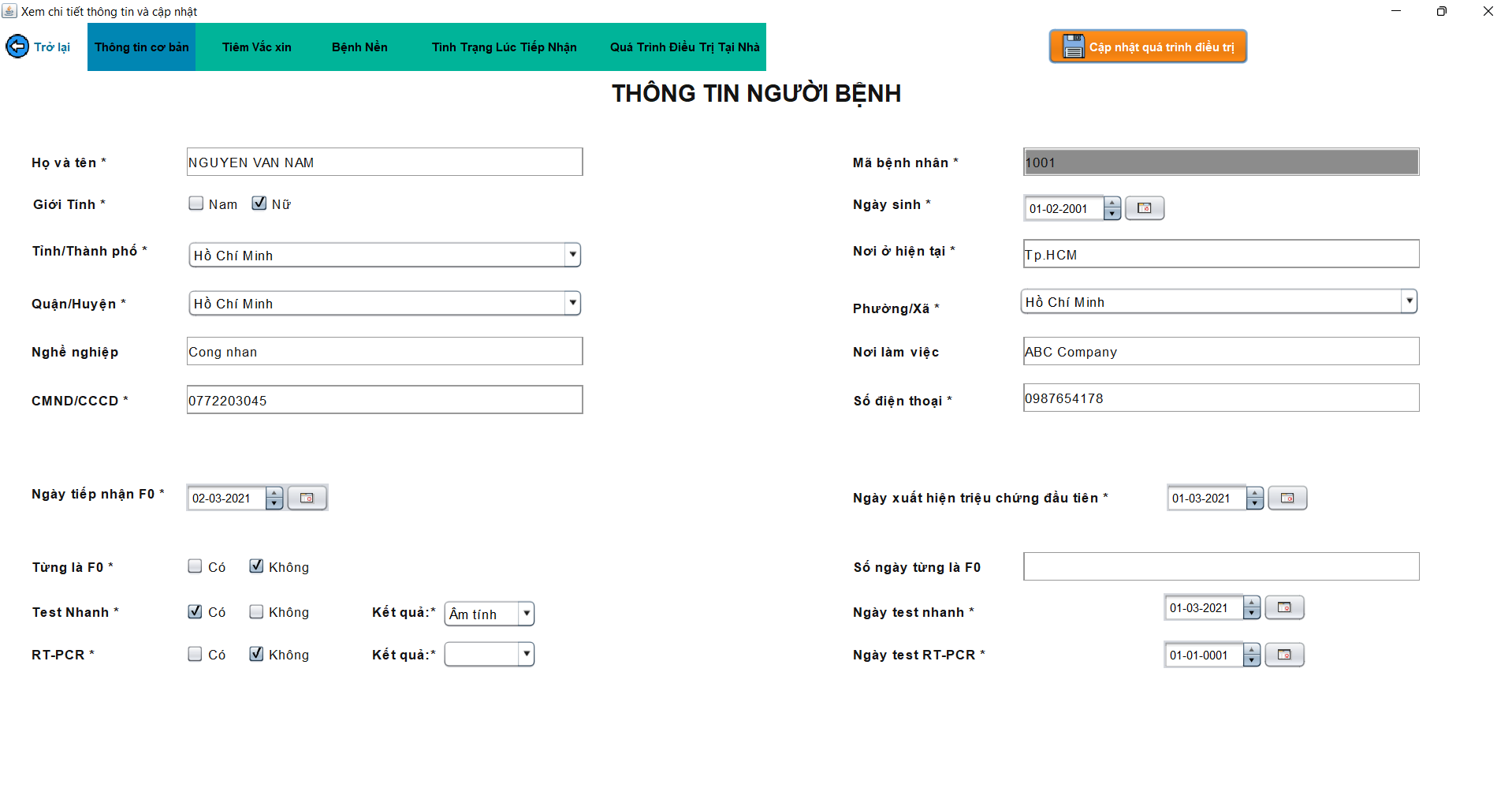 - Cán bộ nhân viên y tế có thể tra cứu, tìm kiếm bệnh nhân, thêm mới bệnh nhân, xóa bệnh nhân, xem chi tiết thông tin bệnh nhân và cập nhật quá trình điều trị tại nhà.