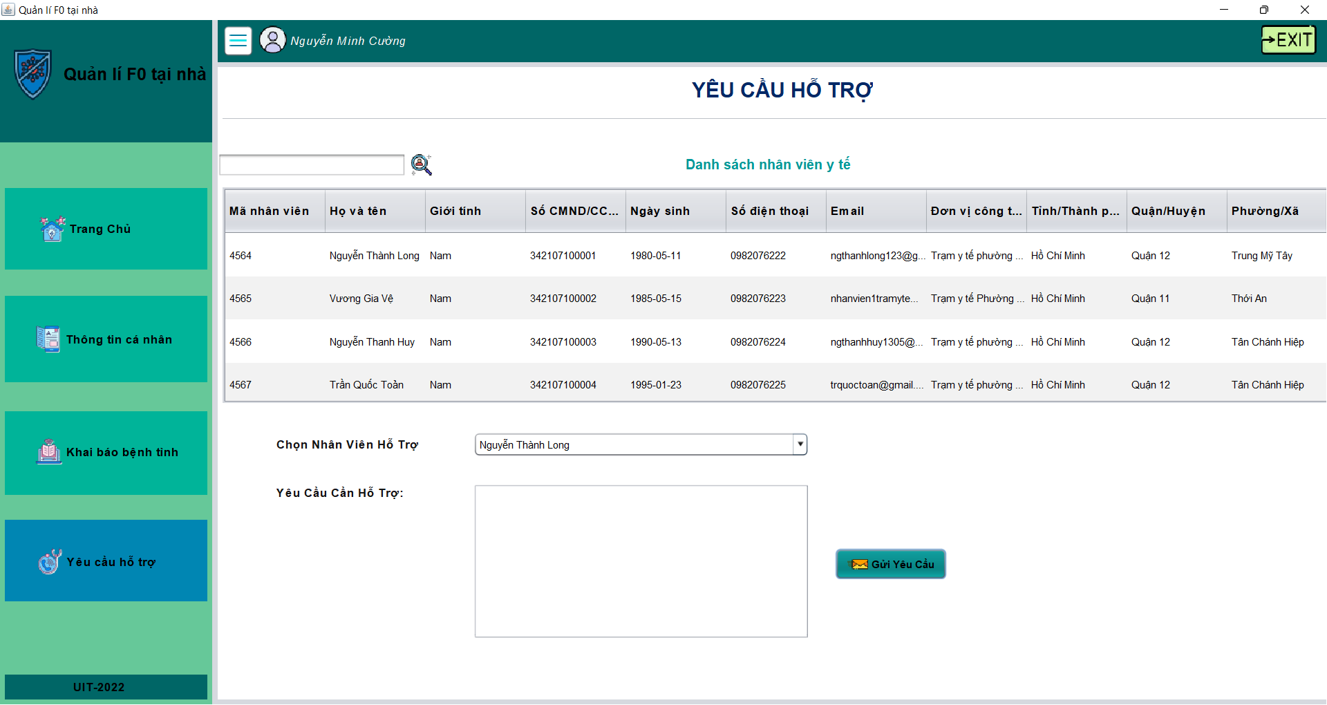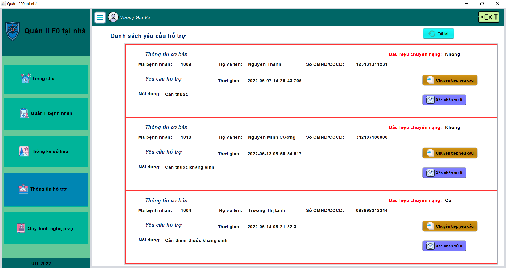 - Cán bộ y tế có thể xin thông tin yêu cầu được hỗ trợ của bệnh nhân gửi đến, xác nhận xử lí và chuyển tiếp hỗ trợ cho cán bộ khác nếu cần