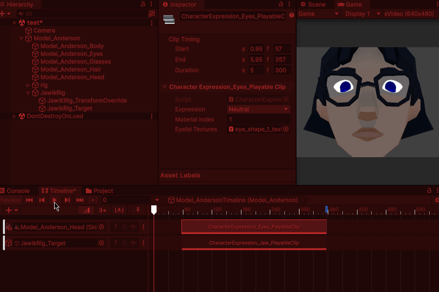 The purpose of this package is to assist animators from animating expressions and talking by hand. This package includes two systems for animating character expressions. One for animiating the jaw and one for the eyes. This package contains behaviours, playables and utilities for controlling eye and jaw expressions.