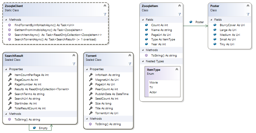 SearchResult result = await ZooqleClient.SearchTorrentAsync(query, page: 1);ReadOnlyCollection<ZooqleItem> items = await ZooqleClient.SearchItemAsync("The IT Crowd");ZooqleItem item = await ZooqleClient.GetItemFromImdbIdAsync("tt0106179");