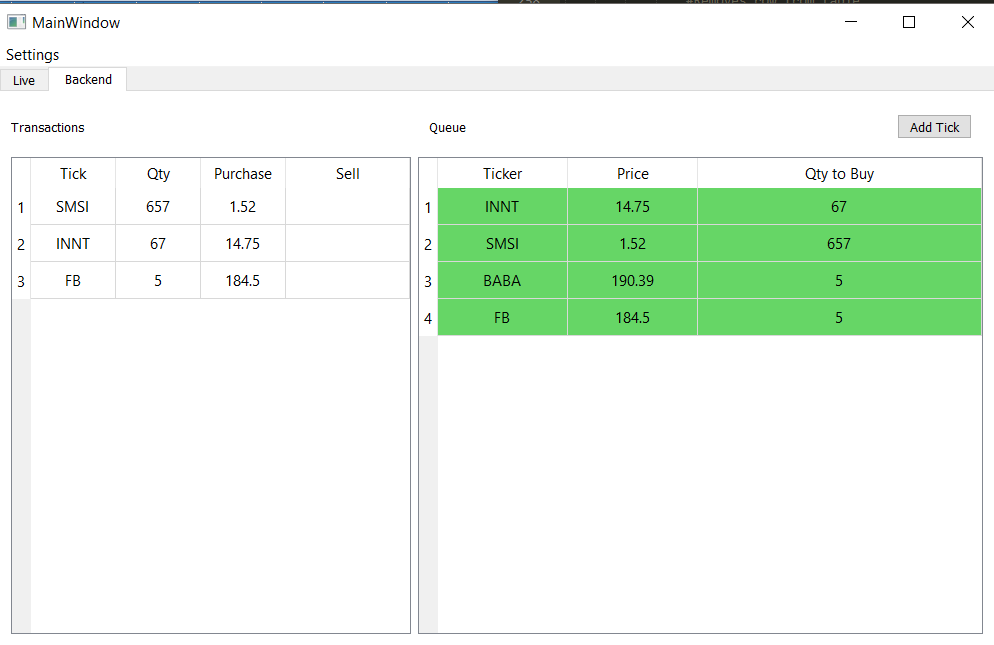 - The Backend Tab features the Transaction and Queue tables. The transaction table shows all transactions that have happened. If a Tick is bought and sold, it will display the appropriate color for that row (Green=profitable trade, Red=non-profitable). The Queue Table holds the list of stocks that are currently waiting to be bought, assuming they meet the criteria.