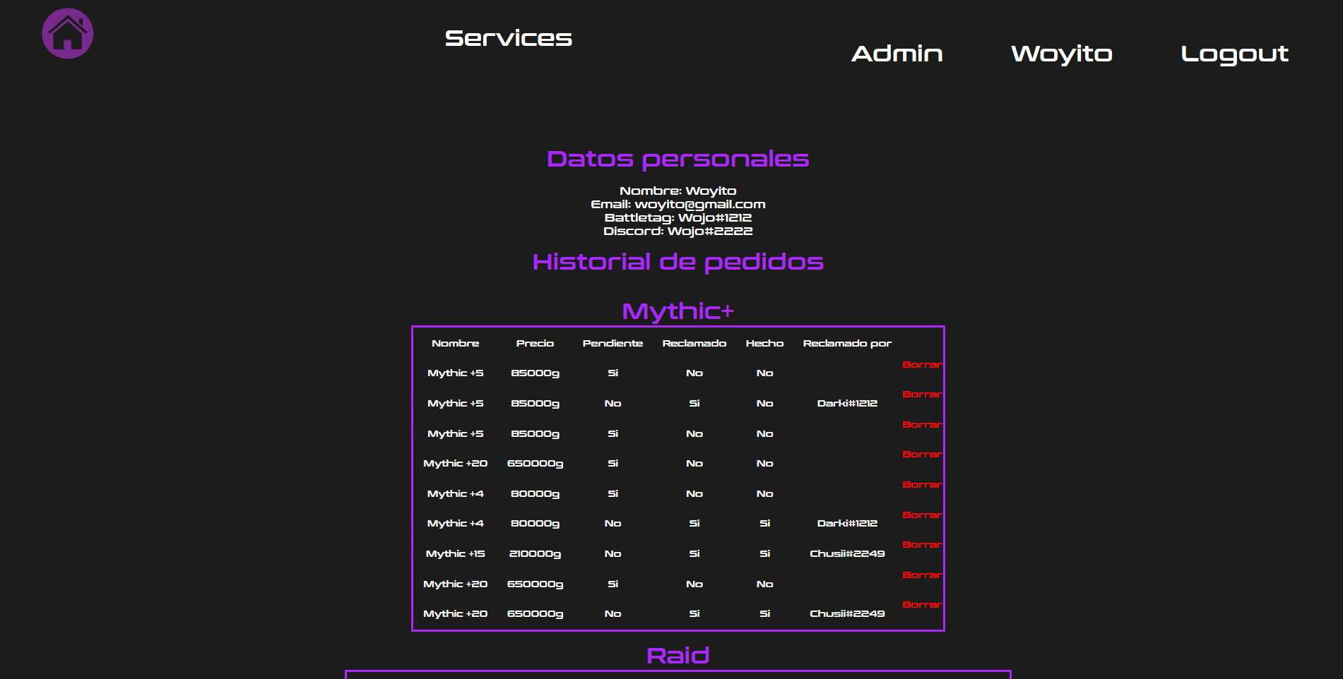 • Una vez realizado el pedido un miembro con el rol "Booster" le agregara a "Discord" con la ID facilitada para ponerse en contacto sobre como y cuando se realizara el pago y el servicio a realizar, dicho miembro se encargara de manternerse en contacto con el usuario en todo momento indicandole tambien cuando actualiza el estado de su pedido para poder revisarlo en el apartado "Profile".