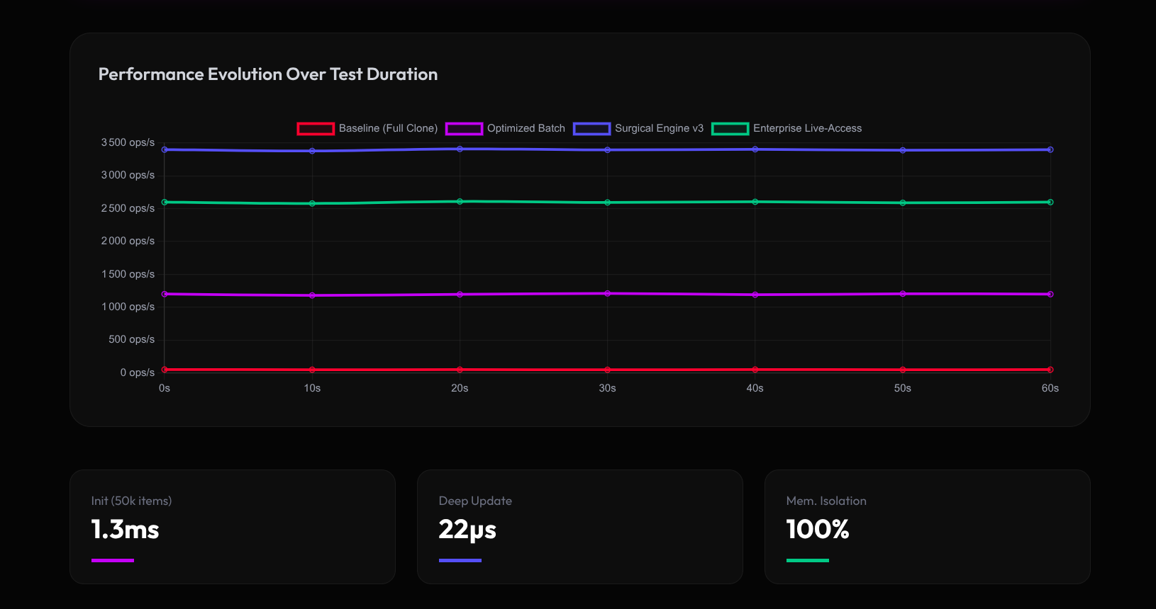 3. Memory Latency: Standard immutable patterns in JavaScript frequently require expensive deep-cloning operations.