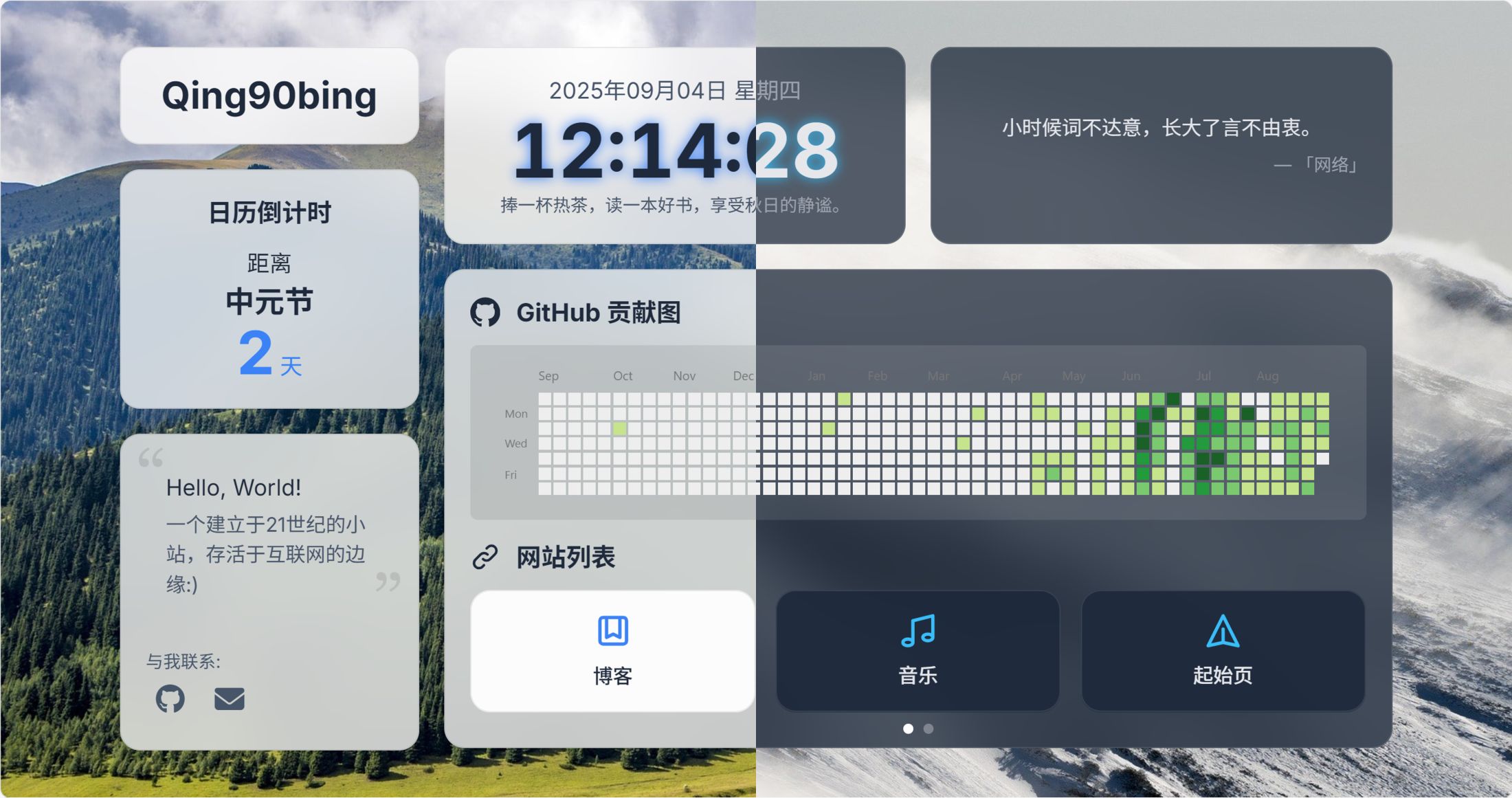 - 主卡片视图: 选择默认显示 GitHub 贡献图还是天气信息。