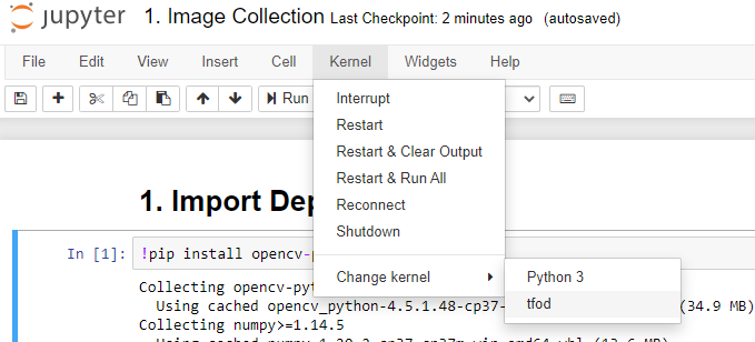 Step 5. Collect images using the Notebook 1. Image Collection.ipynb - ensure you change the kernel to the virtual environment as shown below