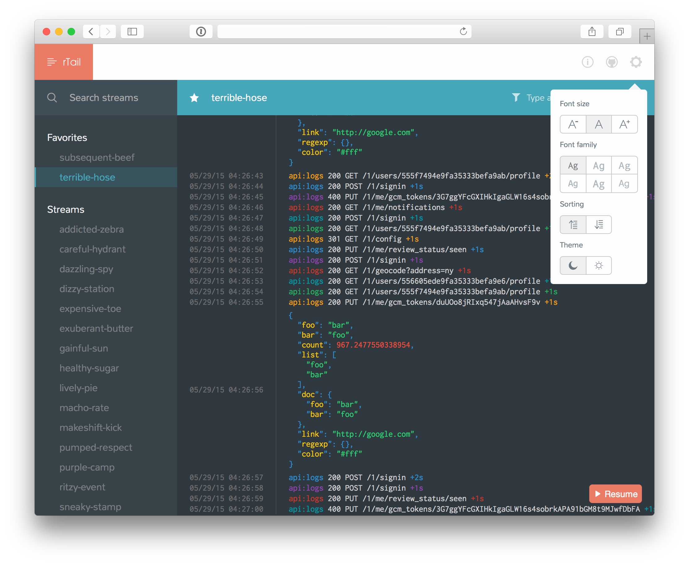 rtail-server receives all messages broadcast from every rtail client, displaying all incoming log streams in a realtime web view. Under the hood, the server uses socket.io to pipe every incoming UDP message to the browser.