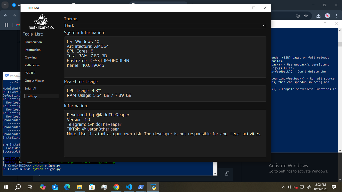 ENIGMA is a PyQt5-based GUI tool that unifies multiple reconnaissance utilities for active and passive information gathering. It features a simple and intuitive interface with both Light and Dark themes. ENIGMA provides a real-time output viewer to conveniently monitor scan results all in one place.