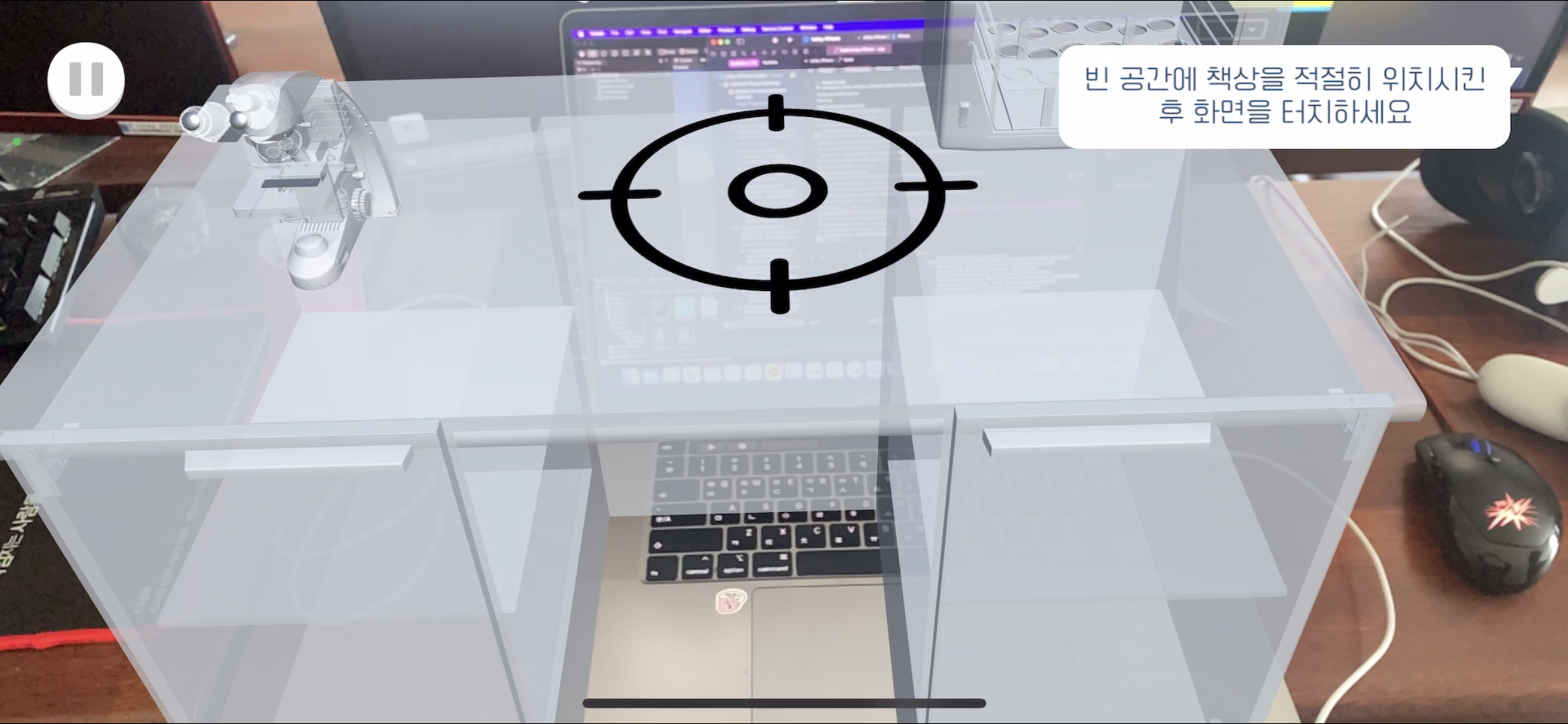 스마트폰 카메라를 통해 평면을 인식하면 실험 테이블이 놓일 위치를 미리 보여줌