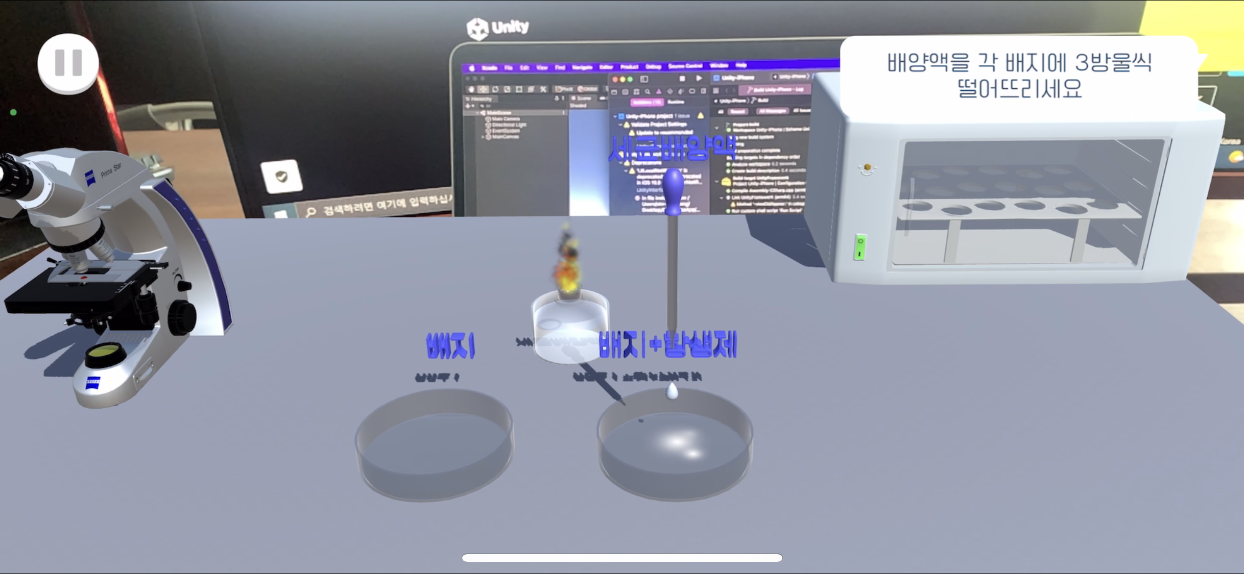 스포이트를 드래그하여 배지 위에 옮겨놓은 후 손잡이 부분을 터치해 각 배지에 배양액을 떨어트린다 - Scene2