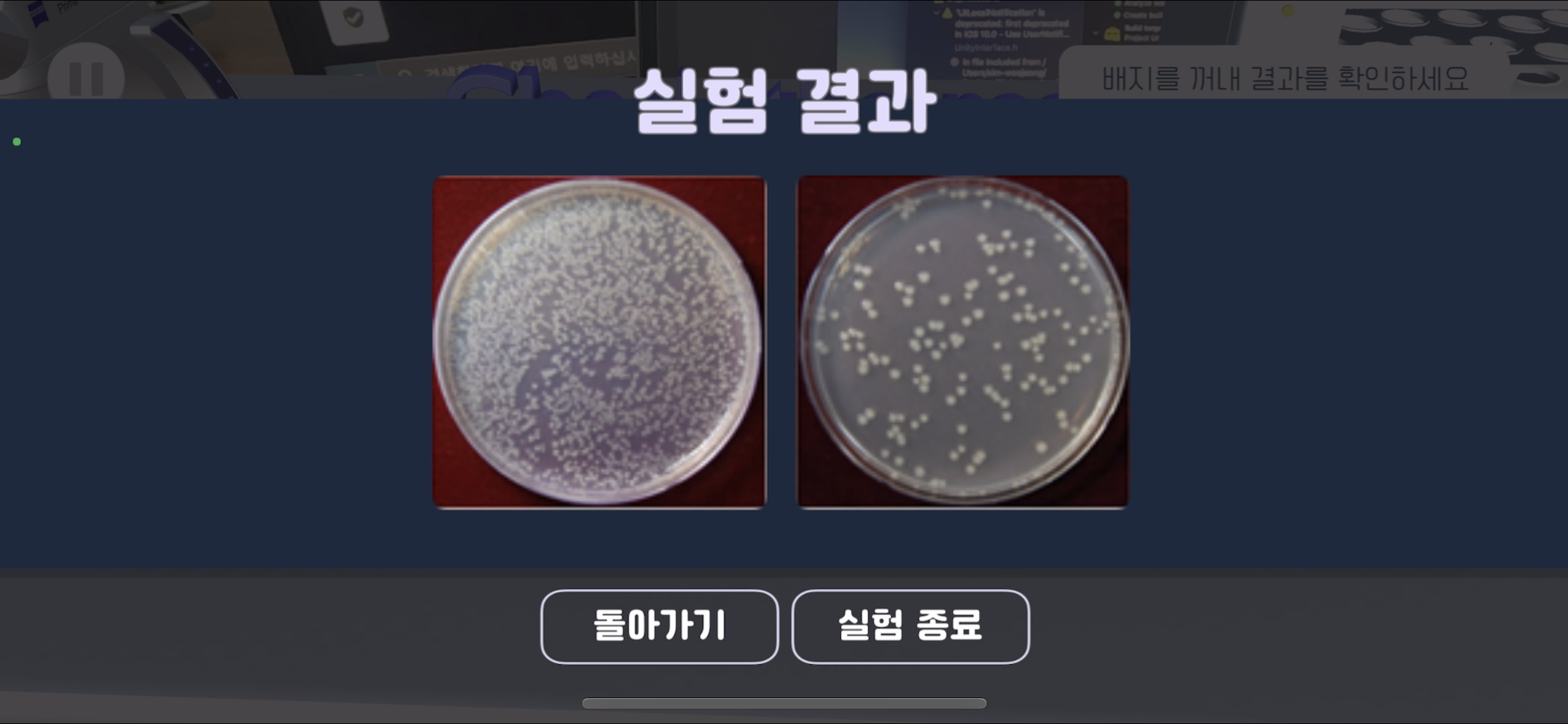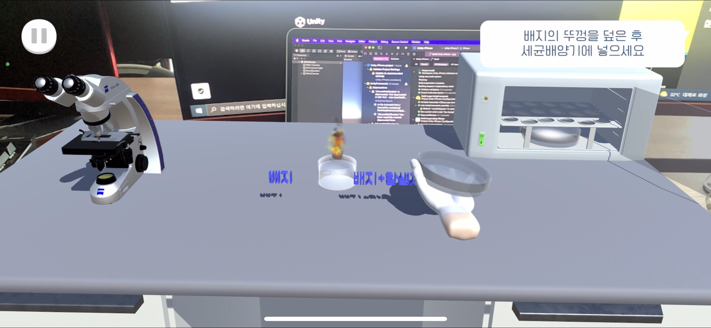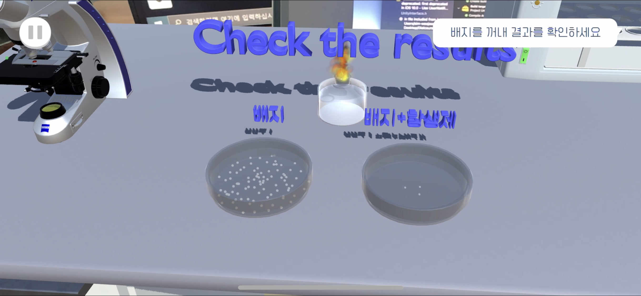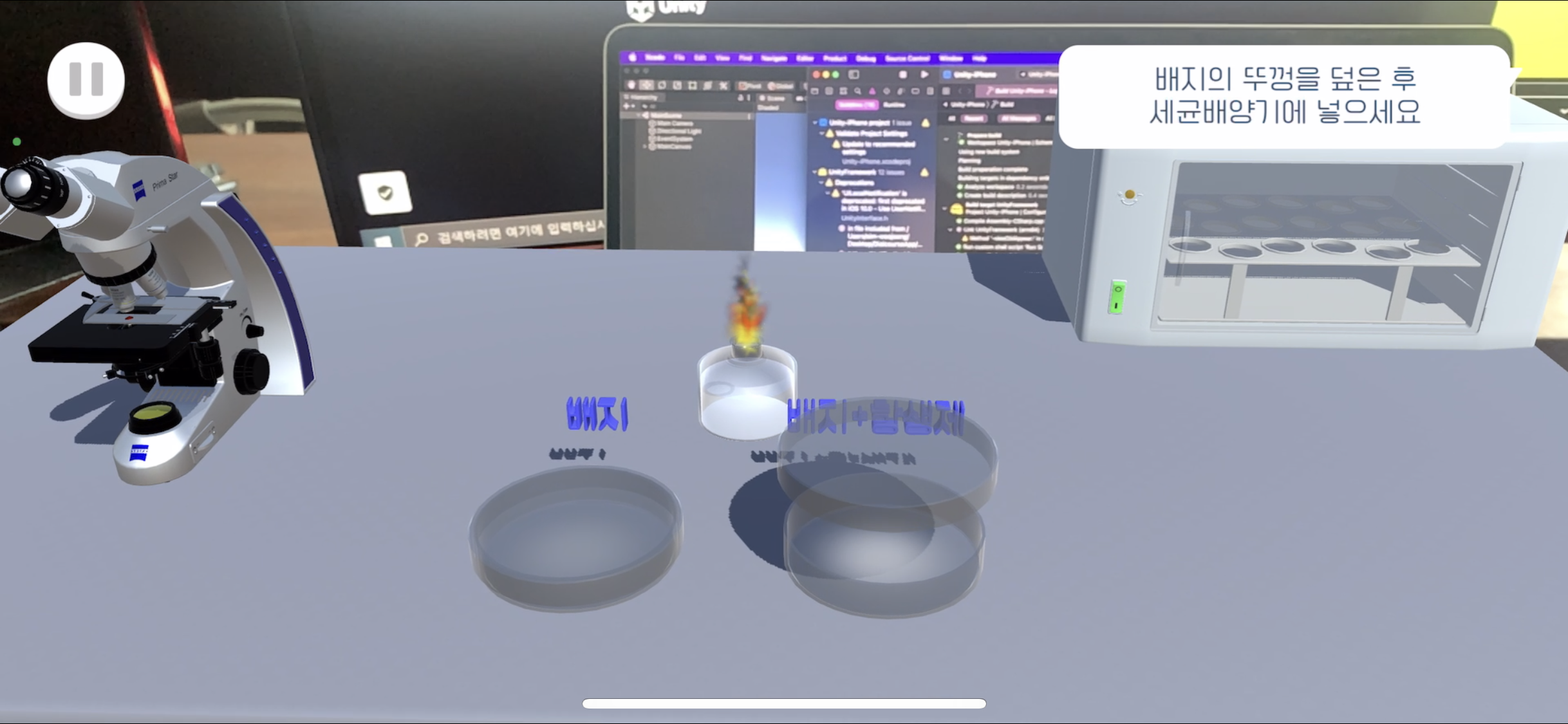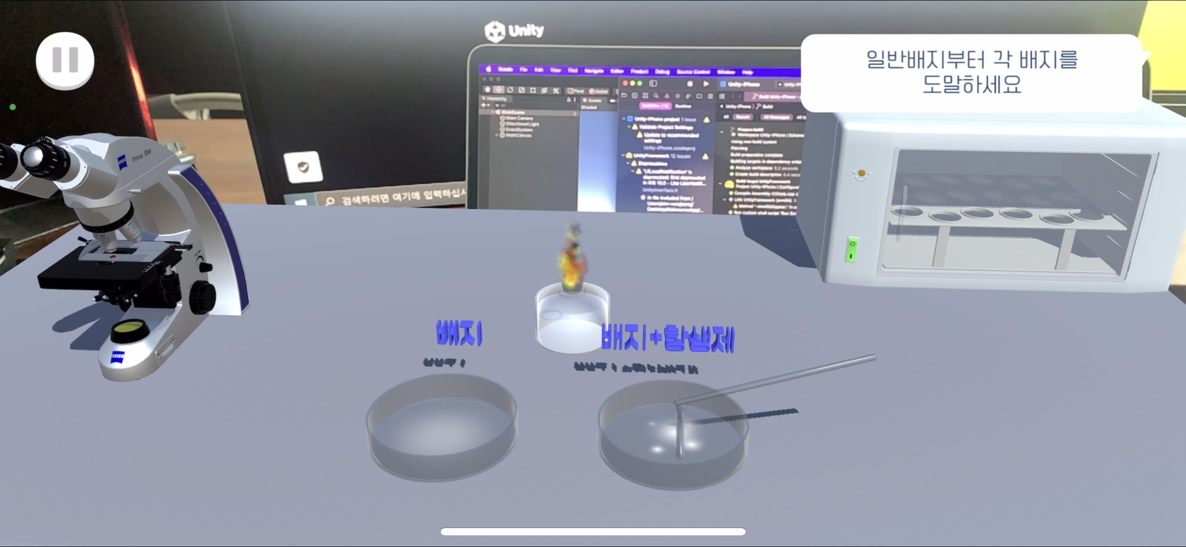 여기서 일반배지가 아닌 항생제 배지를 먼저 도말하려고 할 경우 일반배지가 깜빡이는 효과를 넣었다 - Scene3