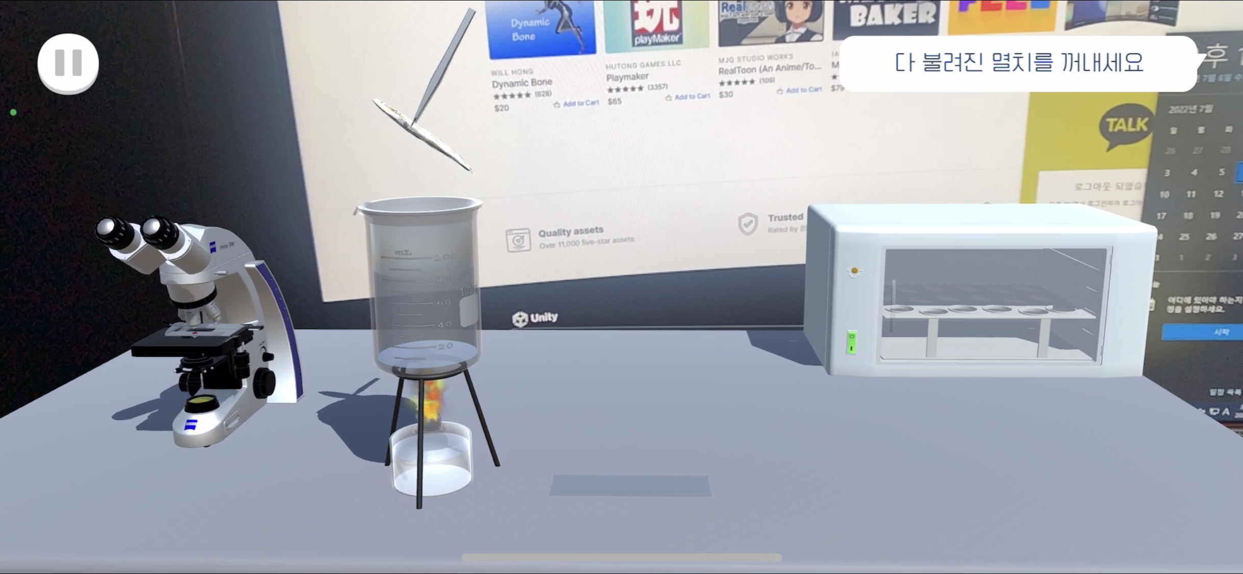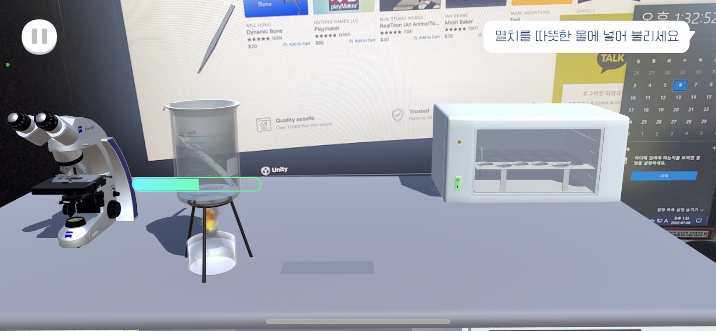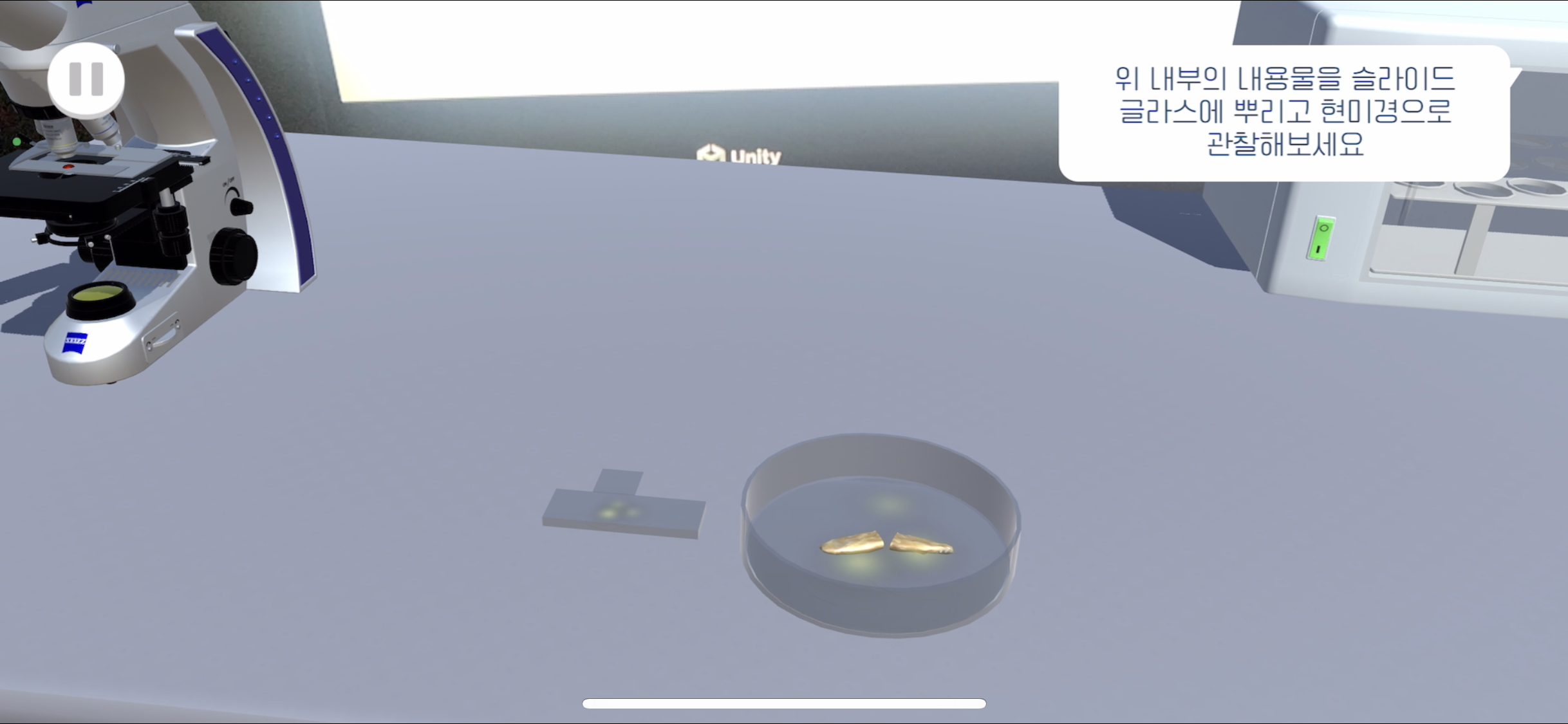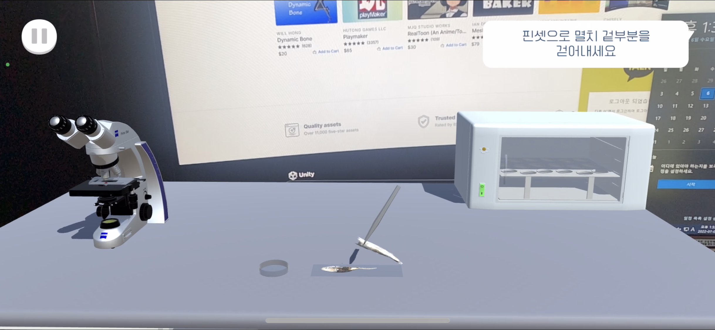 핀셋을 드래그하여 비커 위로 옮기면 멸치가 비커 속으로 들어간다 불리는 게이지가 다 차면 핀셋을 터치하여 멸치를 건져올린다(게이지가 차기 전엔 핀셋의 Lean 컴포넌트를 꺼놓아 움직이지 못 하게 함) 테이블 위의 슬라이드 글라스에 불린 멸치를 옮겨놓는다 - Scene1