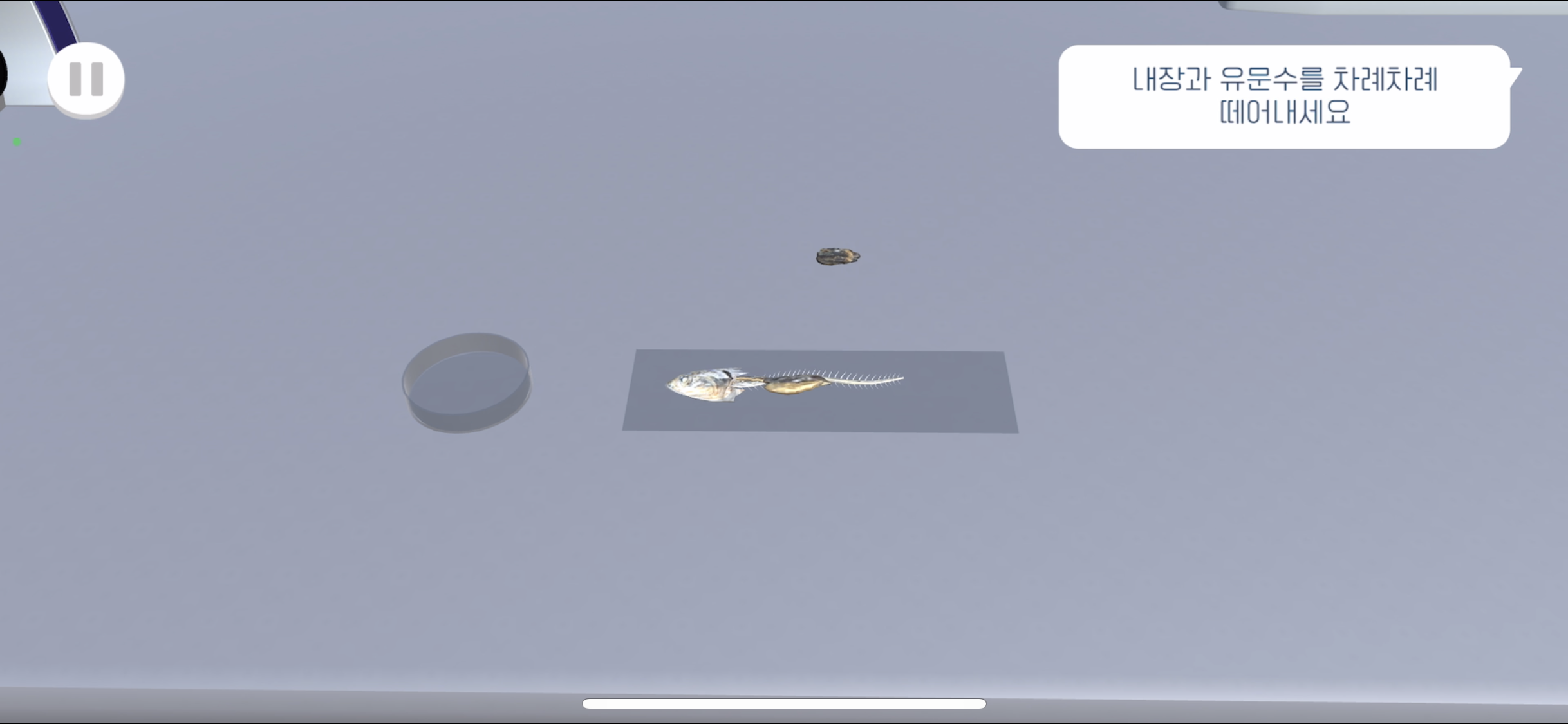 핀셋을 드래그하여 멸치의 겉부분을 걷어낸다 드러난 멸치의 장기와 유문수를 각각 드래그하여 떼어낸다 위를 터치하여 패트리 접시에 옮겨 담는다 멸치의 위가 너무 작기 때문에 편의를 위해 패트리 접시를 터치하여 확대되도록 했다 - Scene2