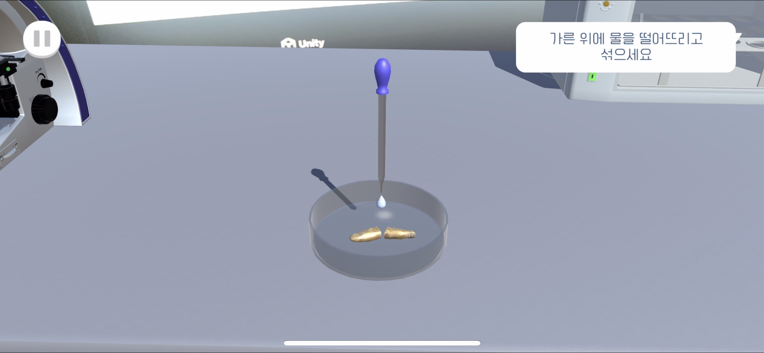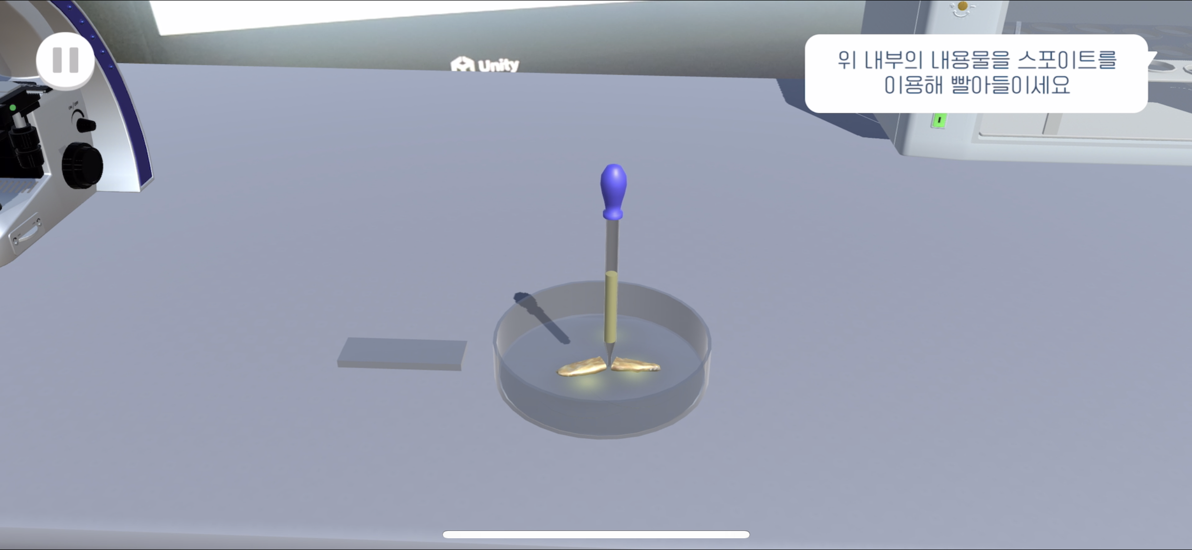 스포이트를 드래그하여 슬라이드 글라스 위에 놓인 후 손잡이 부분을 터치해 몇 방울 떨어트린다