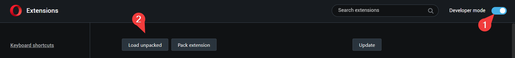 opera://extensionsin the URL bar. - Turn on Developer Mode (top right) and click