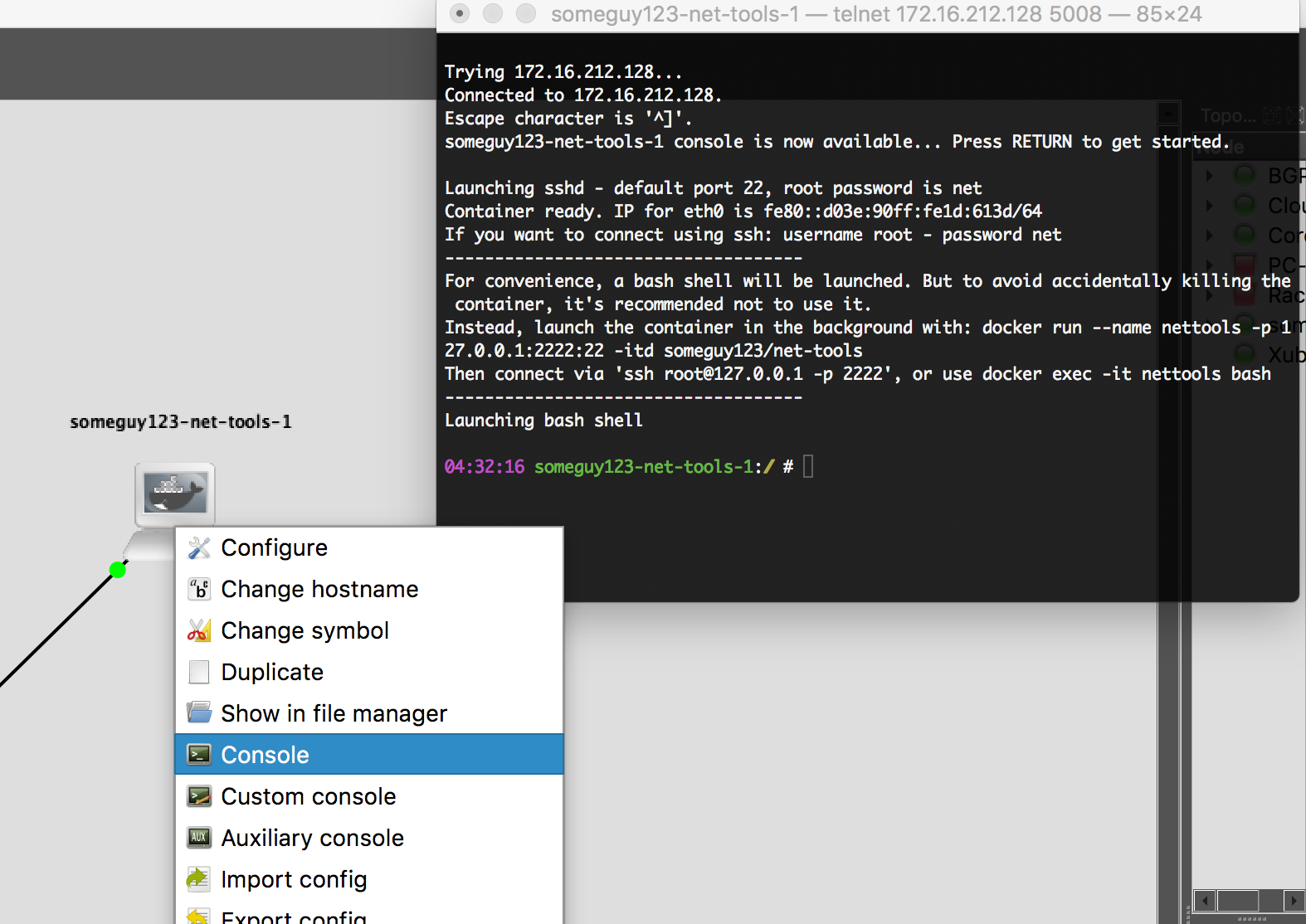 For a better experience, you should be able to connect via SSH to any configured IP addresses. Configure the networking through the Configure menu (will restart the container), or using standard Linux network tools (ip, ifconfig and route are all available). Be warned that persistence is not guaranteed with docker, files such as configurations may get wiped out when the container is shutdown in GNS3.