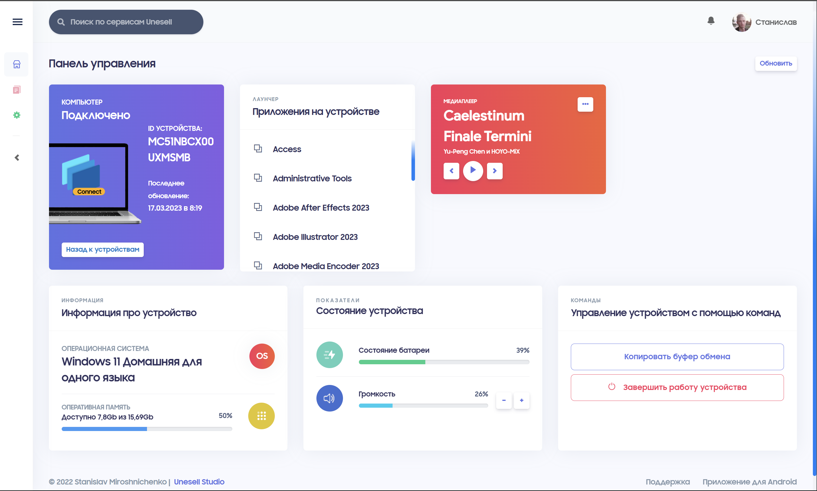 A quick action panel that combines a computer control panel and an Android application client with which you can monitor the battery charge, volume level, control music, the name of the shared clipboard and more.