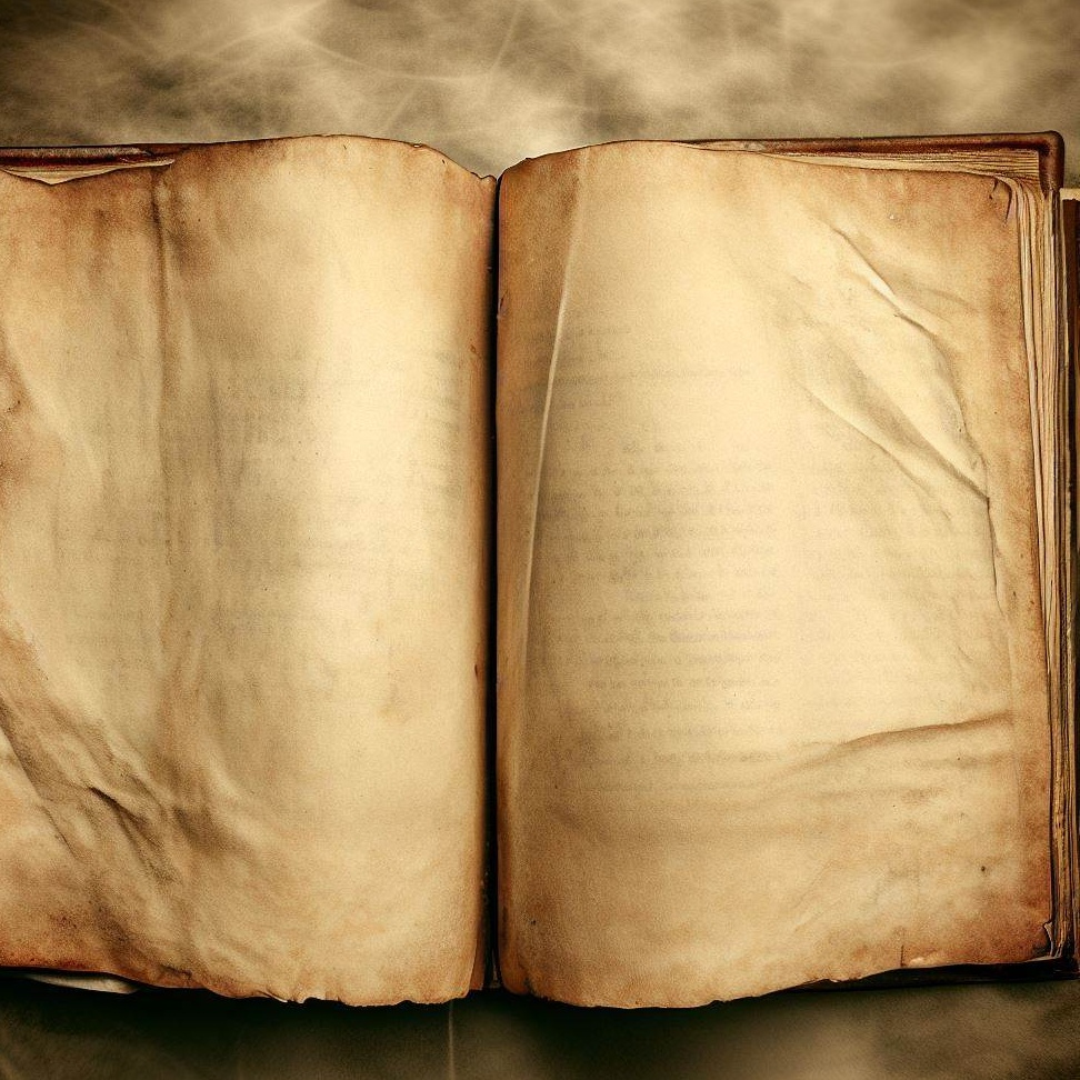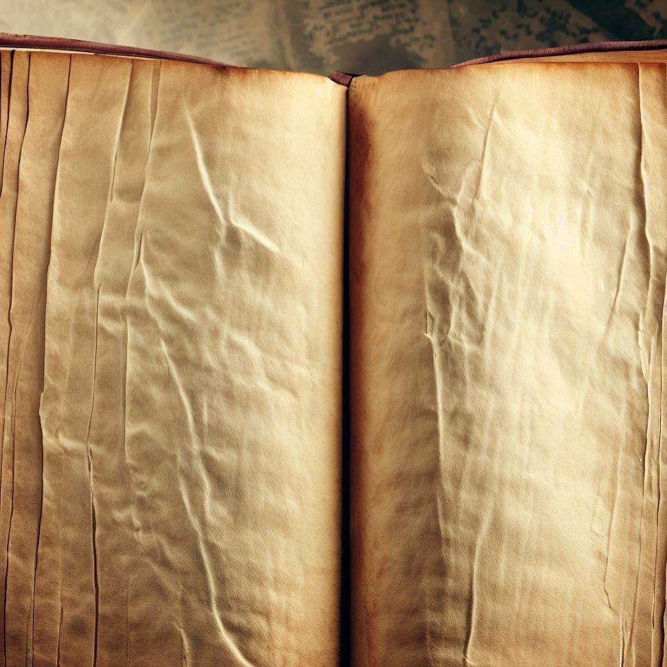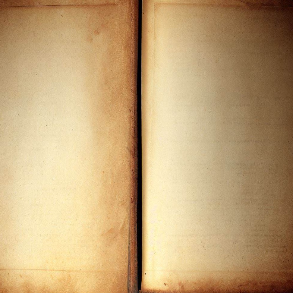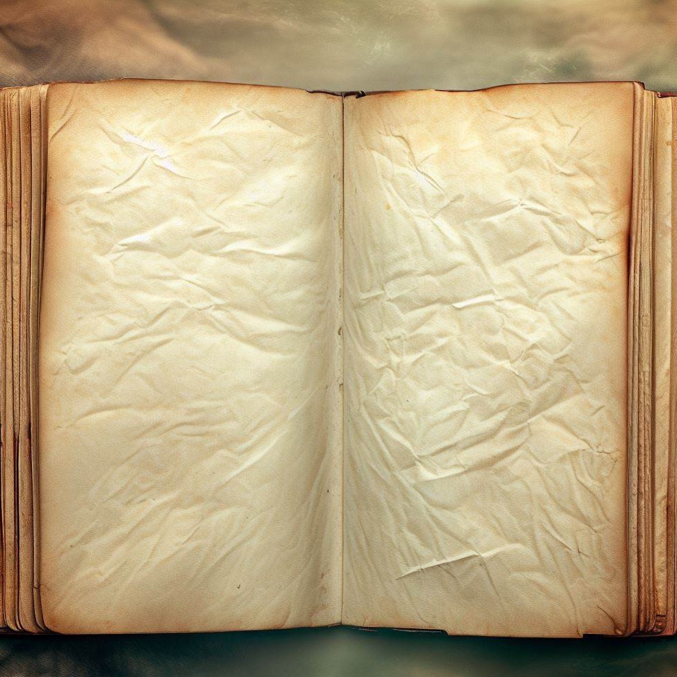 Prompt: full frame aerial view of 2 blank pages of old open book with wrinkles; book is on top of a noisy background