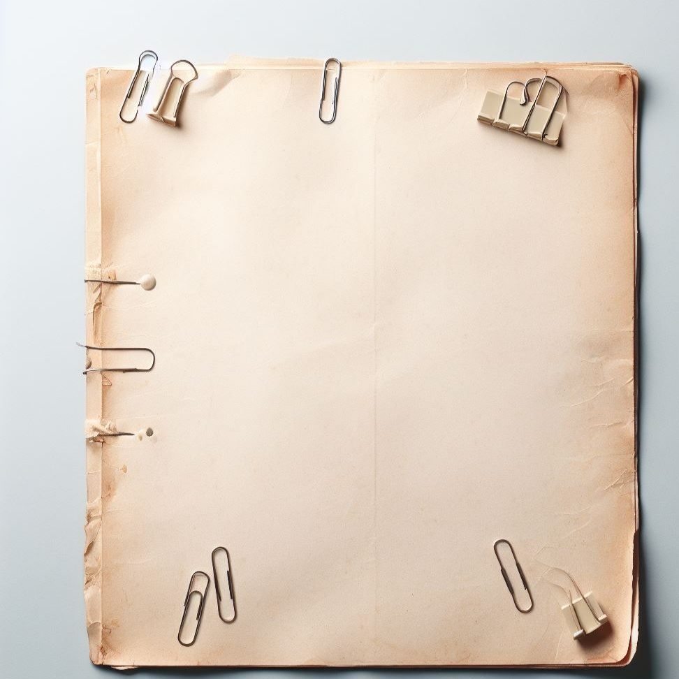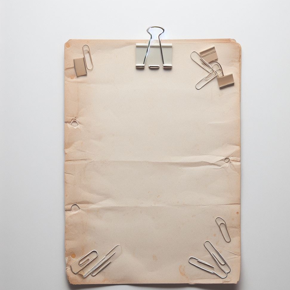 Prompt: blank discolored paper with creases; it is stapled along the top, bottom, and sides, also has paperclips