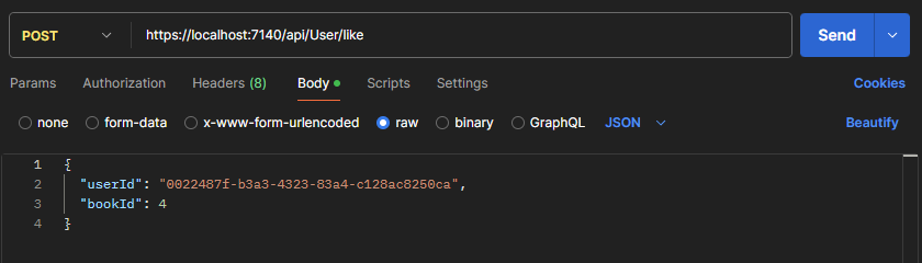 Like book and store the book that the user like in the database Request: { user_id: xxx , book_id: 1}