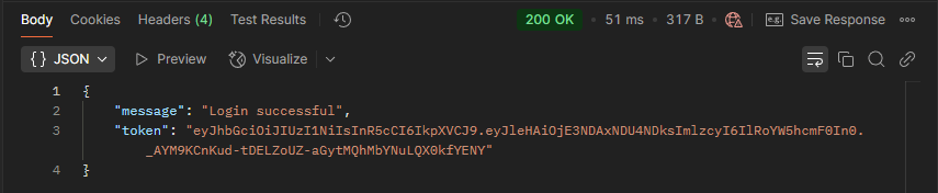 return Ok(new { message = "Login successful", Token = new JwtSecurityTokenHandler().WriteToken(token) });