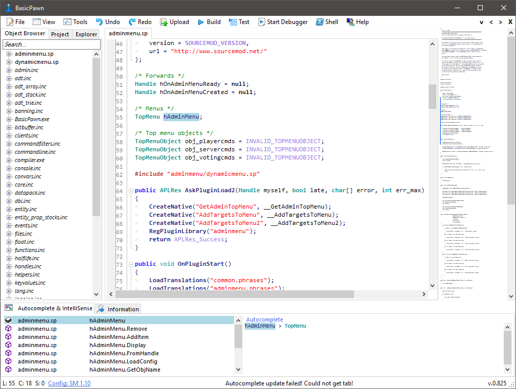 BasicPawn is a very lightweight and basic SourcePawn Editor that uses dynamic Autocompletion and IntelliSense like any other IDE or Advanced Editor. It supports SourcePawn, Transitional SourcePawn and even AMX Mod X. BasicPawn also has some special features like the simple debugger to debug your plugins and the plugin system to create your own BasicPawn plugins.