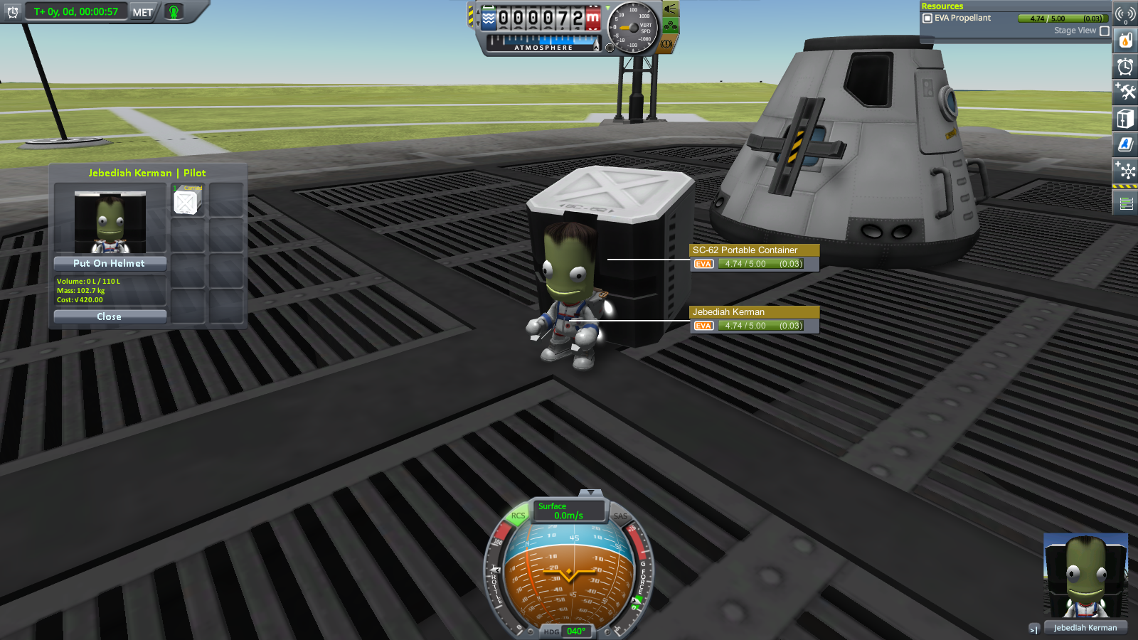 If an EVA kerbal is carrying the SC-62 Portable Container from Kerbal Inventory System, Alternate Resource Panel shows the kerbal carrying twice as much EVA fuel (10 units) as it actually has; stock resource panel shows the default 5 units. If you ask ARP to display all parts with EVA fuel, it lists the kerbal and the SC-62 as carrying 5 units separately (see screenshot). I've verified that the SC-62 does not contain fuel storage of any kind (in particular, if the kerbal burns some fuel with the container off, then puts it on, ARP shows the reduced amount on both parts).