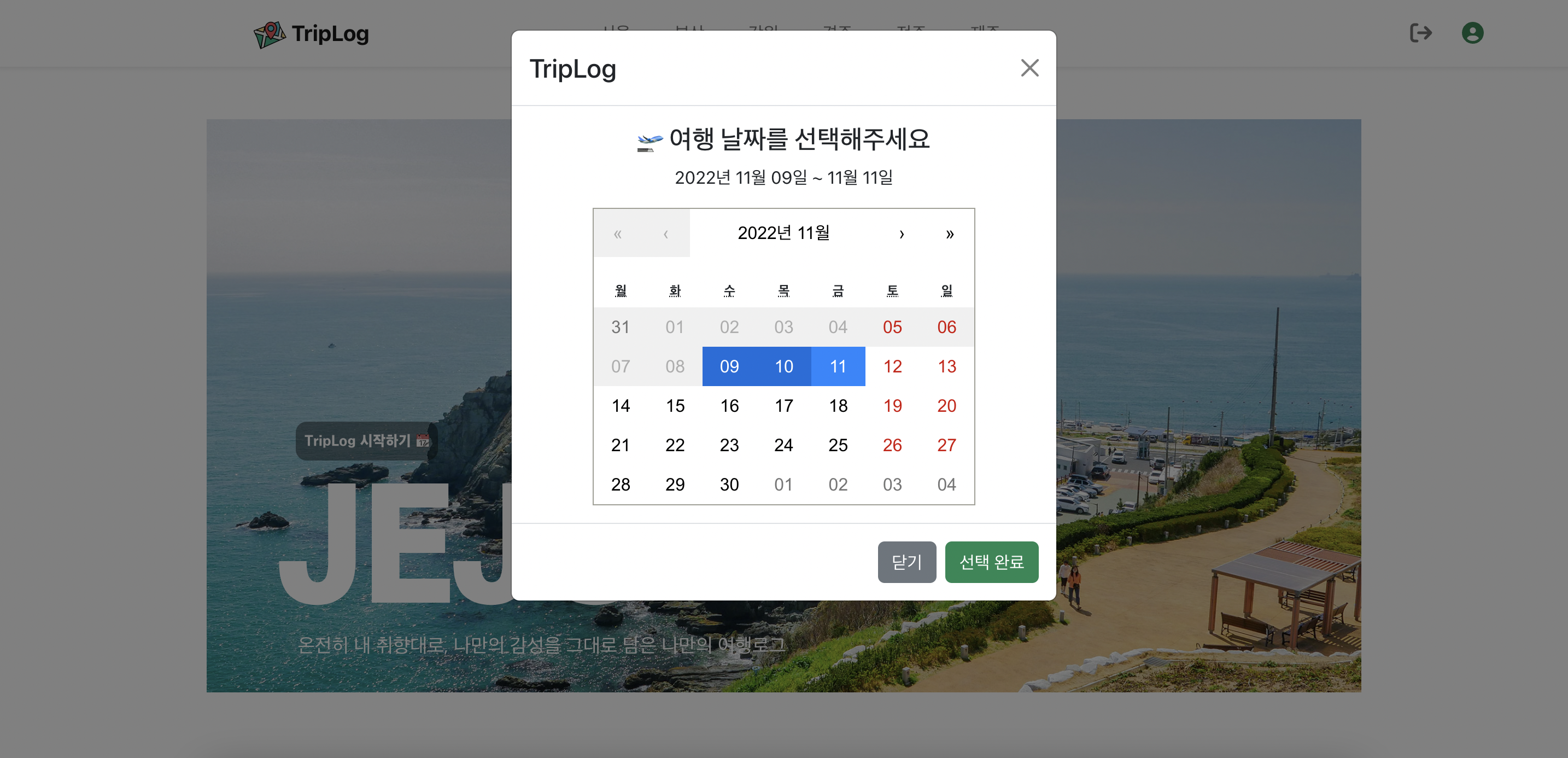 | 제작 의도 | 여행을 하는 순간뿐 아니라! 과정까지 기록을 남겨 브이로그같은 서비스를 구현하고자 트립로그라는 이름으로 제작하였습니다 |