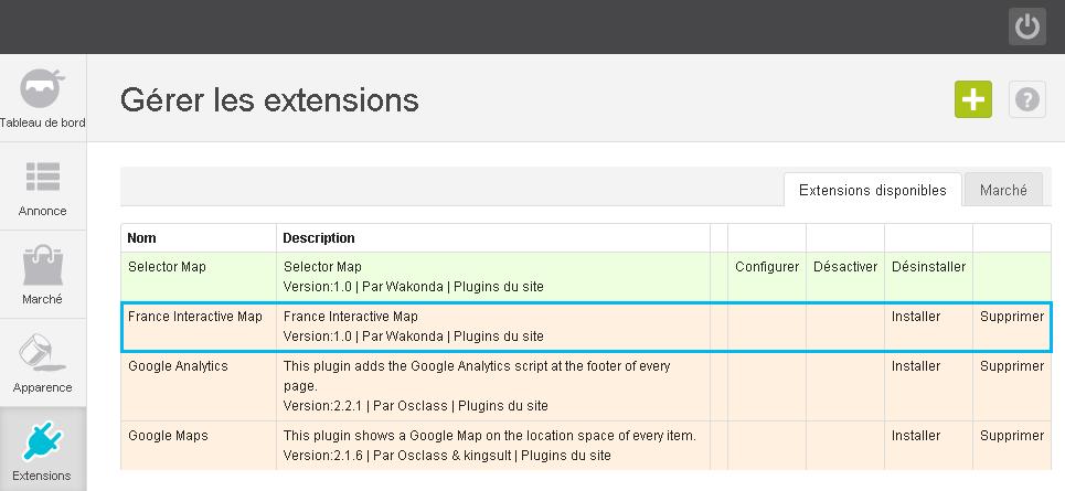 Installez ensuite le plugin depuis l'interface administrateur d'OsClass (votreurl/oc-admin). Pour cela, cliquez sur "Gérer les extensions".