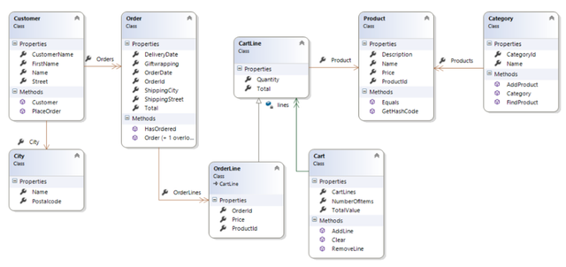 Het domein vormt het hart van een online shop die sportartikelen verkoopt. Klanten (Customer/City) kunnen in de online shop browsen doorheen de producten (Product/Category), en deze naar wens toevoegen aan, of verwijderen uit, een winkelkarretje (Cart/CartLine). Desgewenst kan men de producten die in het winkelkarretje liggen ook effectief bestellen (Order/OrderLine).