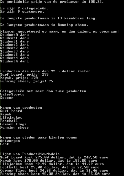 IEnumerable<Product> products = DataSourceProvider.Products;In de Main methode van Program.cs vind je per region een opgave. Je moet telkens de LINQ expressie schrijven die het gevraagde resultaat oplevert. Er is telkens reeds een stukje code voorzien die zorgt voor de uitvoer van het resultaat naar de console.