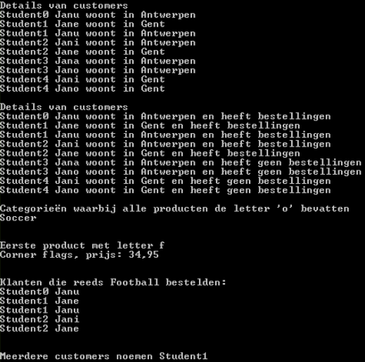 De voornamen en steden voor de klanten deels random werden gekozen. Voor queries waar deze properties gebruikt worden kan je dus een afwijkend resultaat bekomen. Evalueer daarom zelf steeds goed je resultaat. Je kan steeds gebruik maken van breakpoints om de inhoud van
