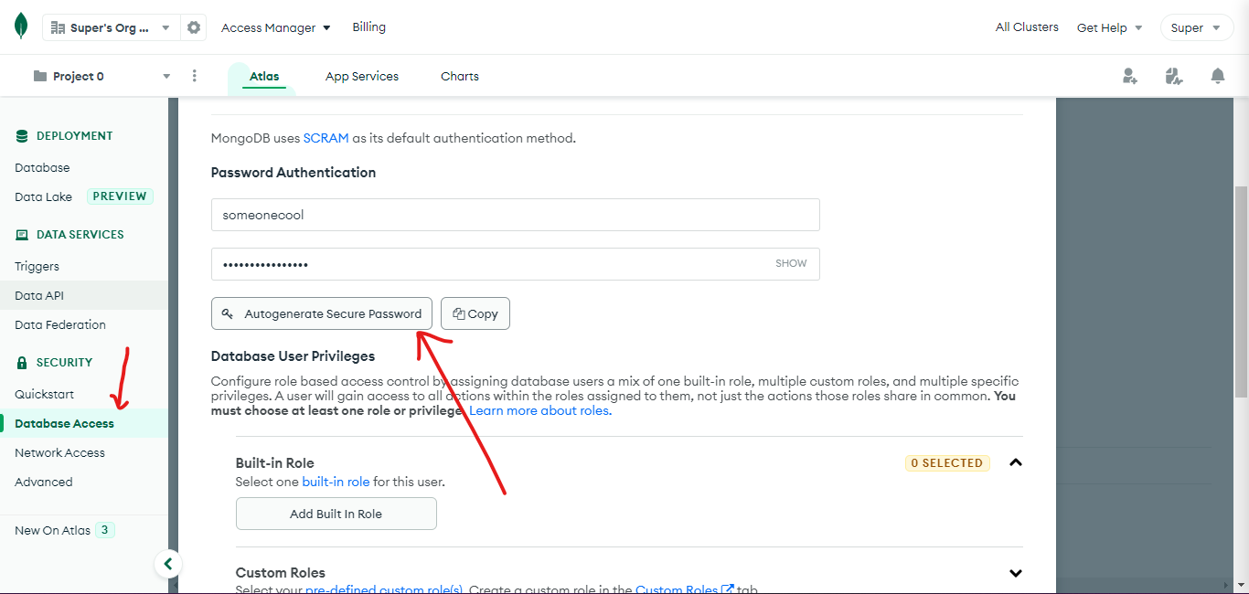 After that click Create Cluster and you'll have a MongoDB instance running. In the dashboard click on Database Access and then click on Add new Database User. Type a username and any password you want. (Generating a password from mongodb is recommended.) Please refer below image for more details.