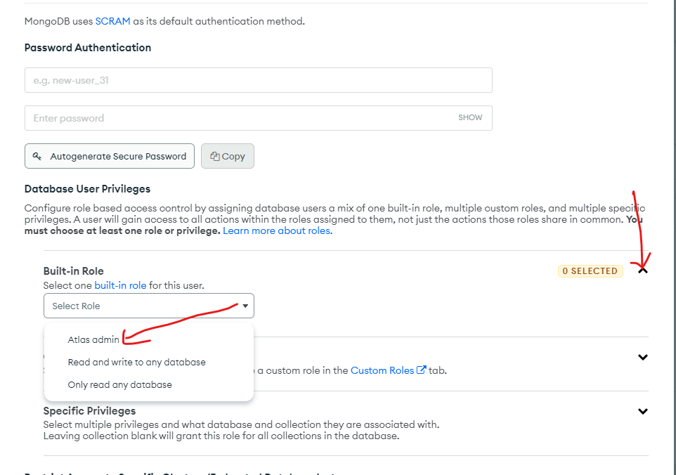 and then don't forgot to adda built in role like below pictures. Built-in-Role -> Select Role -> Atlas Admin like this u can do it!