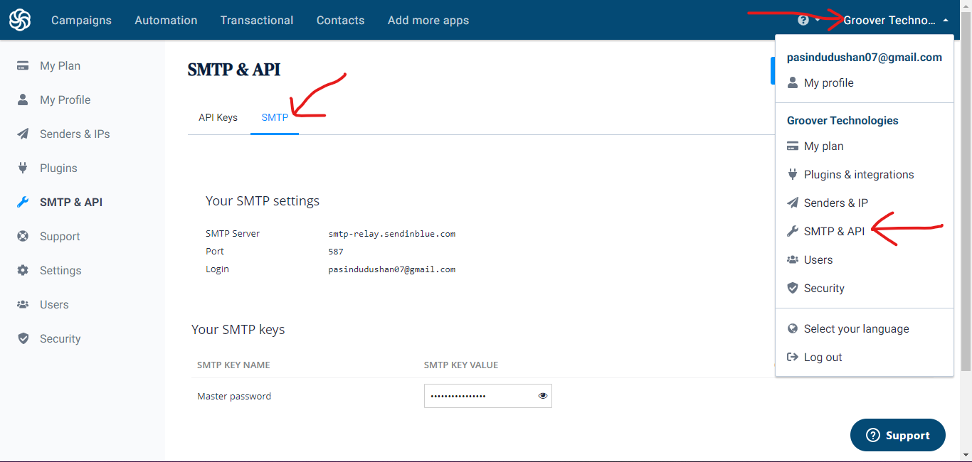 First go to Sendinblue and then Register for a new account. After registering go to the dashboard and then click on the Profile -> SMTP & API -> SMTP. Please refer below if you cannot understand.