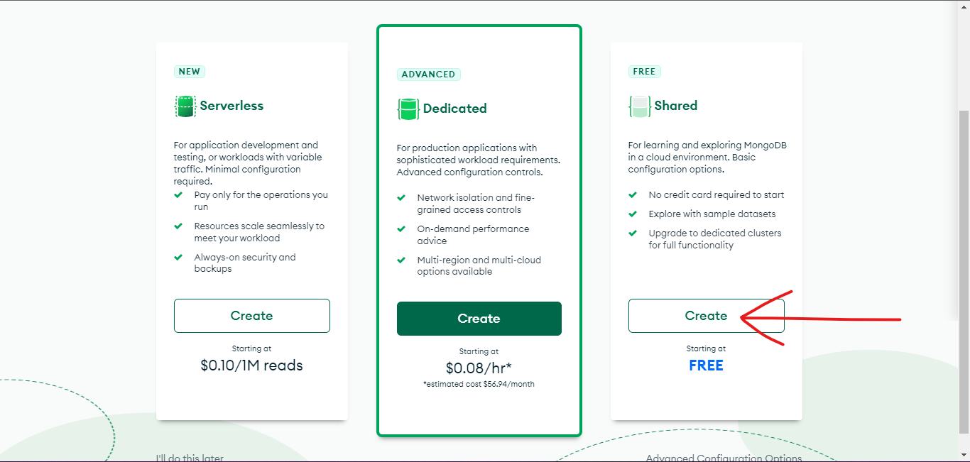 Create an account in MongoDB. Complete the About Me survey mongodb give. After that create a FREE Database in mongodb. Refer below image for more details.