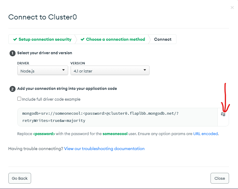 After you copy the URI paste it somewhere you like and then replace the with the password you copied earlier. So your final URI should look something like this.