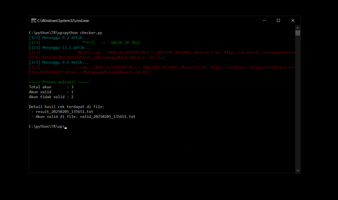 Checker Trakteer is a Python-based account validation tool for Trakteer, designed for efficiency and ease of use. It automatically checks account validity, handles CAPTCHA challenges, and generates detailed logs—all while providing real-time feedback in your terminal.